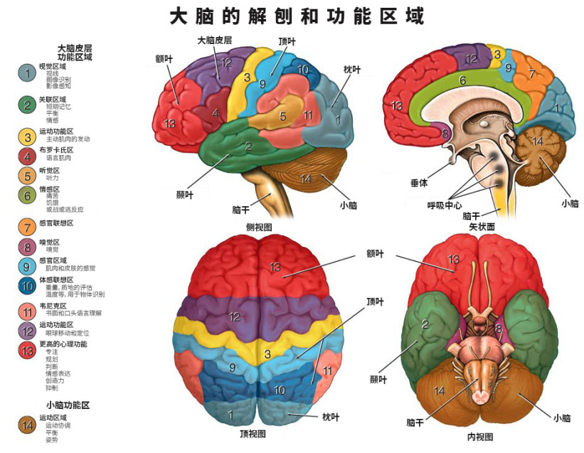 了解治療原理前,先帶大家通過(guò)一張圖片了解一下我們?nèi)四X的不同功能區(qū)域都承擔(dān)著什么功能?